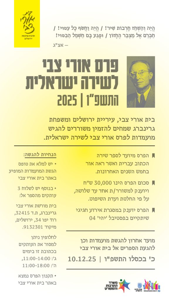 - מועד אחרון להגשת מועמדות וכן להגעת הספרים אל בית אורי צבי: 10.12.2025 | כ' בכסלו התשפ"ו